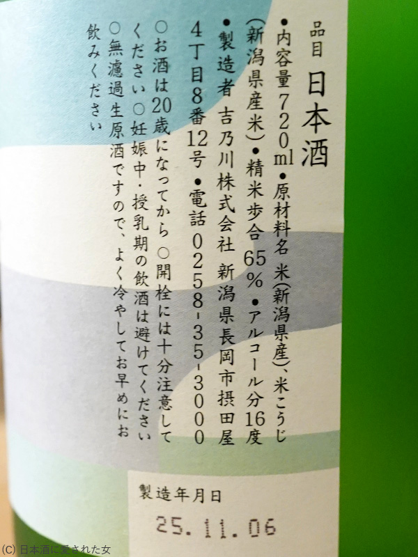 | 製造者 | 吉乃川(株) 新潟県長岡市摂田屋4丁目8番12号 |