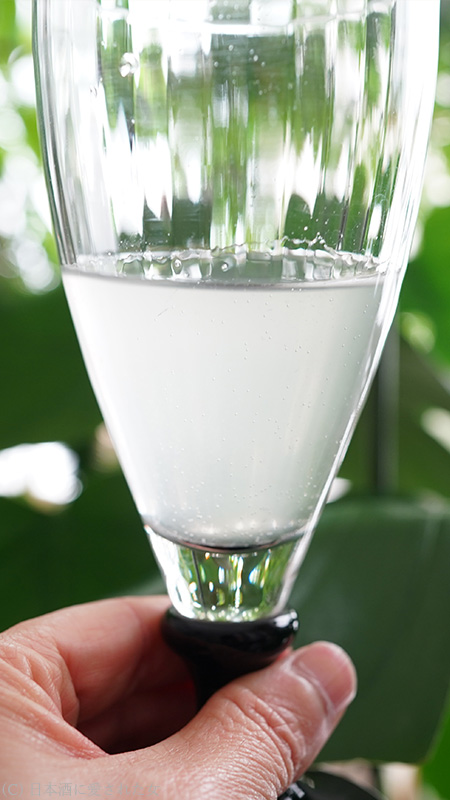 ワイングラスに微発泡の日本酒を注ぐと、まず小さな気泡がピチピチとグラスについていく様子を眺めます(^^)
