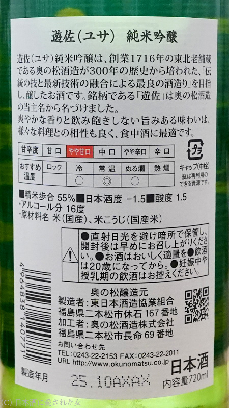 出典:ヨドバシドットコム > 奥の松酒造 遊佐 純米吟醸 16度 720ml [日本酒]